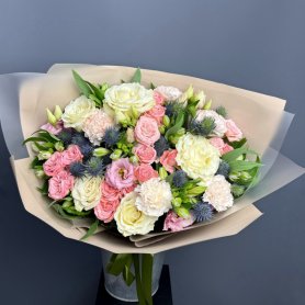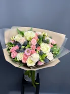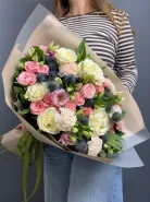 Авторский букет «Ягодный сорбет» изящно сочетает в себе элегантность роз Эквадор и кустовых роз с яркими акцентами эрингия, альстромерии и лизиантуса. В оформление добавлены нежные диантусы, создавая ощущение свежести и сладкого ягодного настроения. Этот букет наполнен теплом и насыщен приятными ароматами, вызывая ощущение легкости и радости.