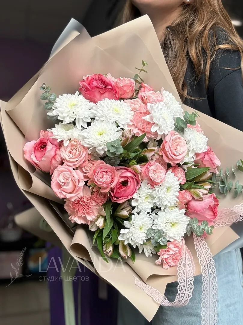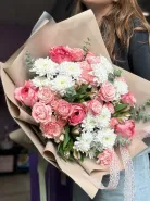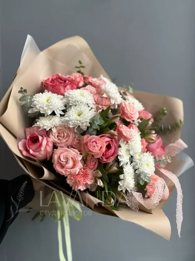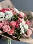 Букет «Сияй» — это яркое сочетание свежести и элегантности, созданное для вдохновения. В его композицию входят изысканные Розы Эквадор пионовидной и кустовые розы, добавляющие объём и роскошь. Кустовая хризантема придает букету структуру и стойкость, а диантусы добавляют нежности и легкости. Эвкалипт нежно обвивает цветы, создавая фоновый зелёный акцент и приятный аромат. Альстромерия в букете привносит нотки утончённости и оригинальности. Такой сборный букет идеально подходит для поднятия настроения или особого подарка.