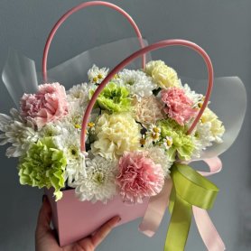 Цветы в сумочке «Весна в сердце» — это изящный букет, созданный для тех, кто ценит красоту и утонченность. В его составе гармонично сочетаются яркие диантусы, объемная кустовая хризантема, нежный танацетум и свежий рускус. Такой букет идеально подойдет для подарка или для украшения интерьера, принося ощущение весенней свежести и радости. Компактная сумочка добавляет необычности и позволяет легко держать цветы в руках.