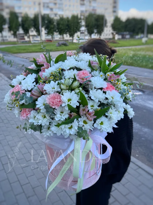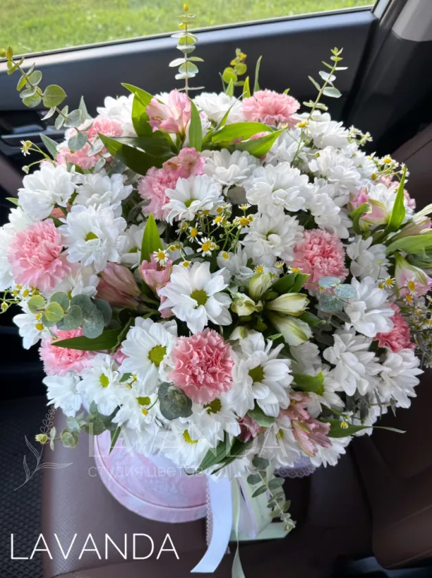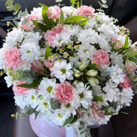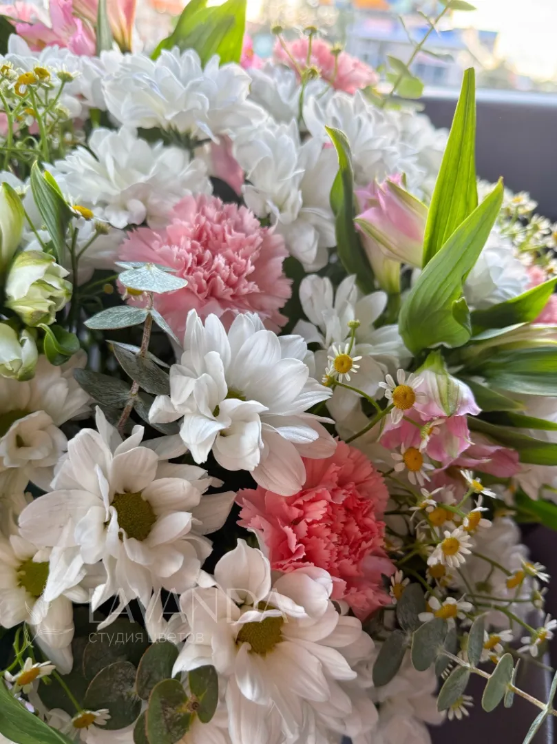 Композиция «Нежное облако» создаст атмосферу уюта. В её составе — нежные оттенки кустовых хризантем, изящные диантусы, яркие альстромерии, романтичный танацетум и свежий эвкалипт. Эта цветочная гармония дополнит любой интерьер и подарит вам ощущение лёгкости и спокойствия. Закажите «Нежное облако» и окружите себя нежностью и красотой природы.