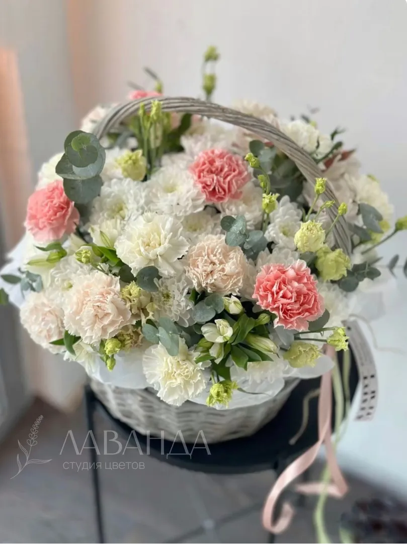 Цветы в корзине из диантусов и лизиантуса «Самой нежной»