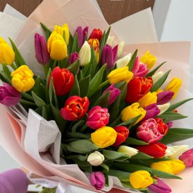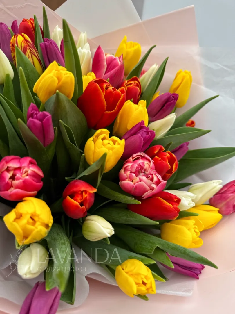 Букет из яркого микса тюльпанов. В букете используется гладкий и пионовидный тюльпан. Роскошный букет для поднятия настроения к 8 марта.