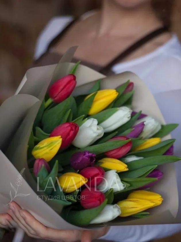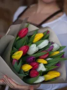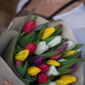 Букет из ярких фермерских тюльпанов. Используются тюльпаны микс т.е. разного цвета. Упаковка букета в спокойных тонах, которая подчеркивает яркость самого цветка.